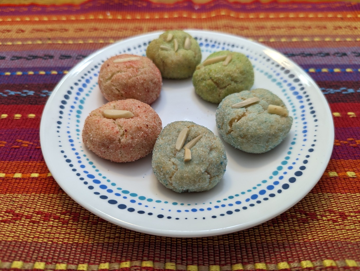 - Cover a baking sheet with parchment paper. For each cookie, scoop 2 to 3 teaspoons of dough and roll into a ball. Roll each ball in colored sugar, and press a slivered almond into the top of each cookie. Place cookie balls on parchment paper, leaving at least 1 to 2 inches between cookies.