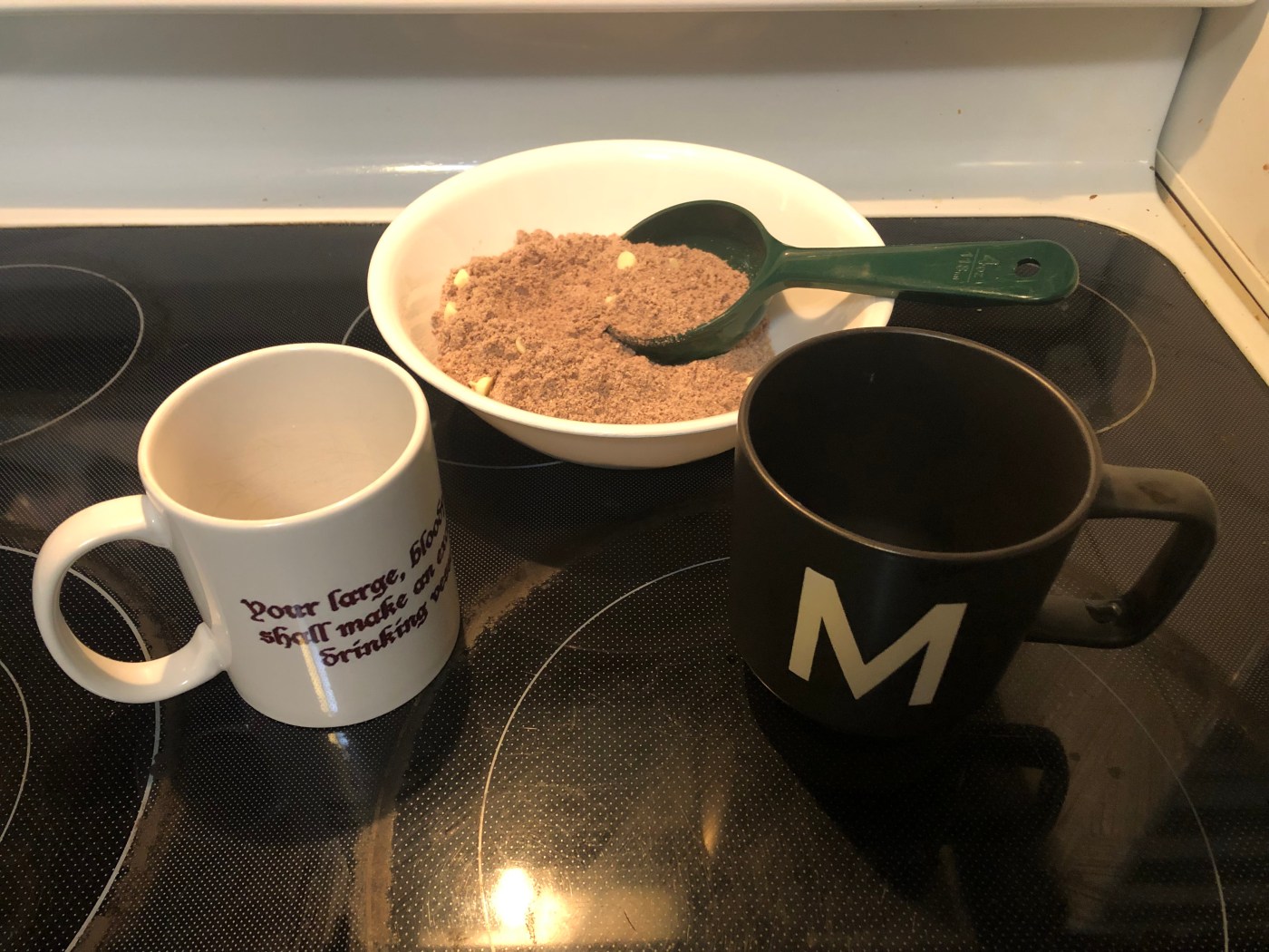 The concept of a powdered muffin mix that could be stored in the pantry and quickly baked into a muffin in a ceramic mug with only water and microwave time has been floating around the Internet for a while. I developed my own version of the mug muffin mix a couple of years ago for my son who needed more protein, fiber, and calories in his diet and had grown tired of standard breakfast fare. My recipes for the mug muffins are all gluten free, vegan-possible, lower in sugar than most recipes, and higher in fiber and protein. Be forewarned, the full mug recipe is over 300 calories per muffin, so these are not meant as a low-calorie snack. Nonetheless, the volume (and therefore the calories) can be cut in half by using only half the mix in the recipe. If the half muffin is not enough of a breakfast, top it with chopped fruit, such as strawberries, blueberries, or bananas. I leave it to the student to experiment.